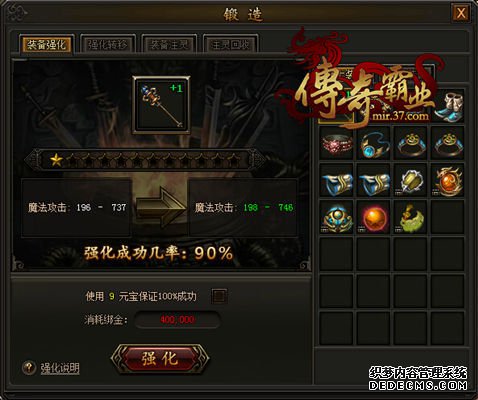 最后推荐的是装备的强化,以及BOSS积分以及功勋称号。之所以摆到最后才讲是因为这些前期都不用急着去升的,第一因为装备弄得再好,有可能被人杀了就爆掉了,这样一来基本就前功尽弃了。至于BOSS积分,可以通过平时打BOSS和在线的时候累积增加,或者可以101级之后花费人物经验来兑换,直接元宝购买的话,因为属性提升不是很多性价比不算太高所以不推荐;功勋称号也是如此,可以通过每日的功勋除魔,不用怎么花费元宝就可以获得不少的功勋,所以这两样不用急着去升。不过,如果你是大R超R不缺钱的话就不用考虑这些了!传奇霸业私服地址:玩传奇霸业SF就看这里
